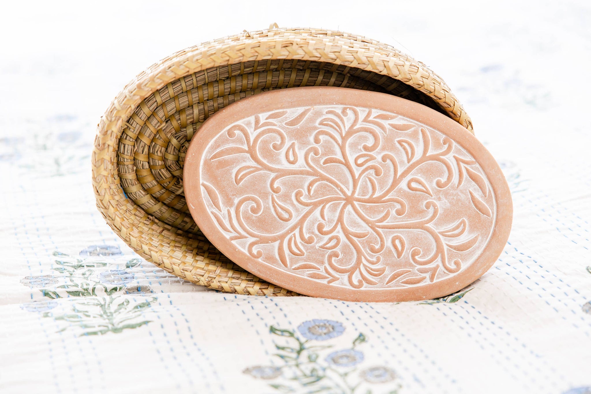 This bread warmer basket is the ideal gift for home bakers who love sharing their freshly made loaves with family and friends. Simple to use, it keeps your bread warm throughout dinner! Featuring a charming design with a whitewashed terracotta stone, this sturdy, functional basket also doubles as an attractive fall centerpiece. Perfect for keeping pies, biscuits, tortillas, pumpkin muffins, and all your favorite baked goods warm. Wonderful for year-round entertaining.