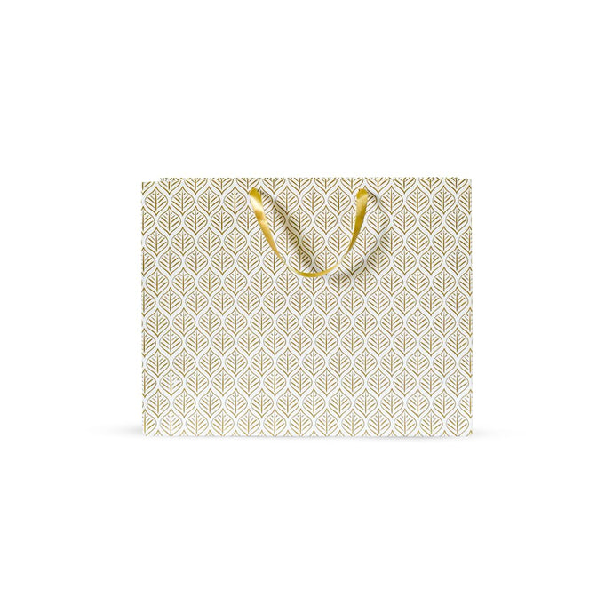 Satin Ribbon Handle White & Gold Printed Gift Paper Large Carry Bags - Big (13 * 17 * 4 Inches) (Pack of 5) (Lilac Leaf)