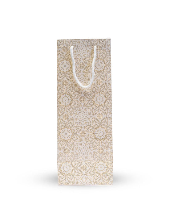 Wine Bottle White & Gold Printed Paper Carry Bag - (5 * 4 * 14 Inches) (Pack of 5) (Cream Flower)