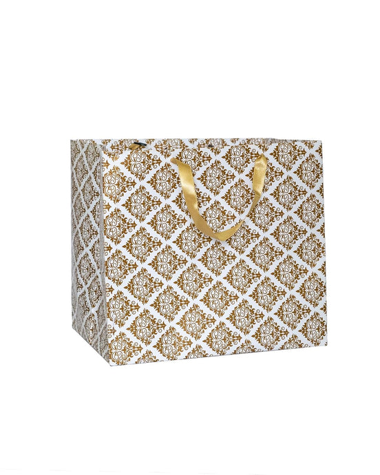 White & Gold Printed Gift Paper Carry Bag -Small (9 * 8 * 3Inches) (Pack of 5) (Royal Flower)