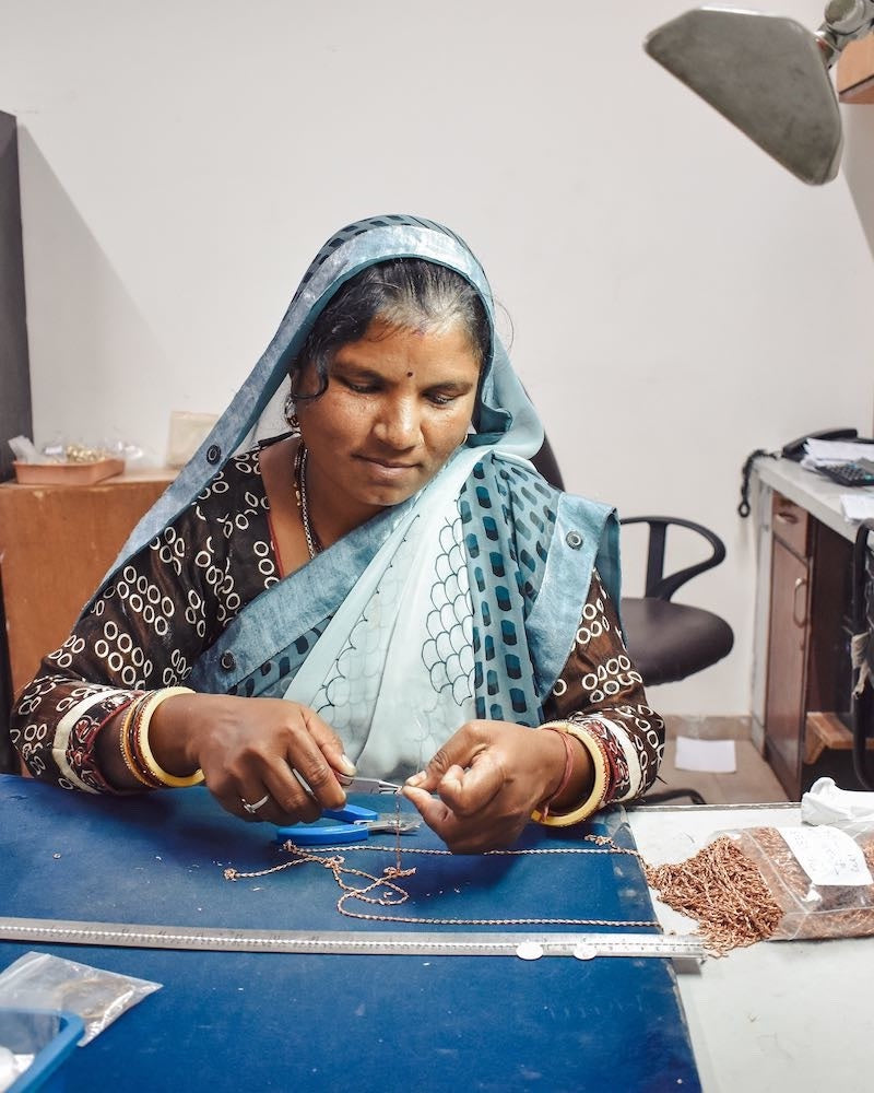 The Golden Bow Necklace creates safe jobs for women ending poverty cycles in India and creating the opportunity for them to earn a dignified income. This elegant necklace features a dainty golden bow on a simple chain. The Golden Bow Necklace is perfect for daily wear or paired with other ethical styles for a layered look.