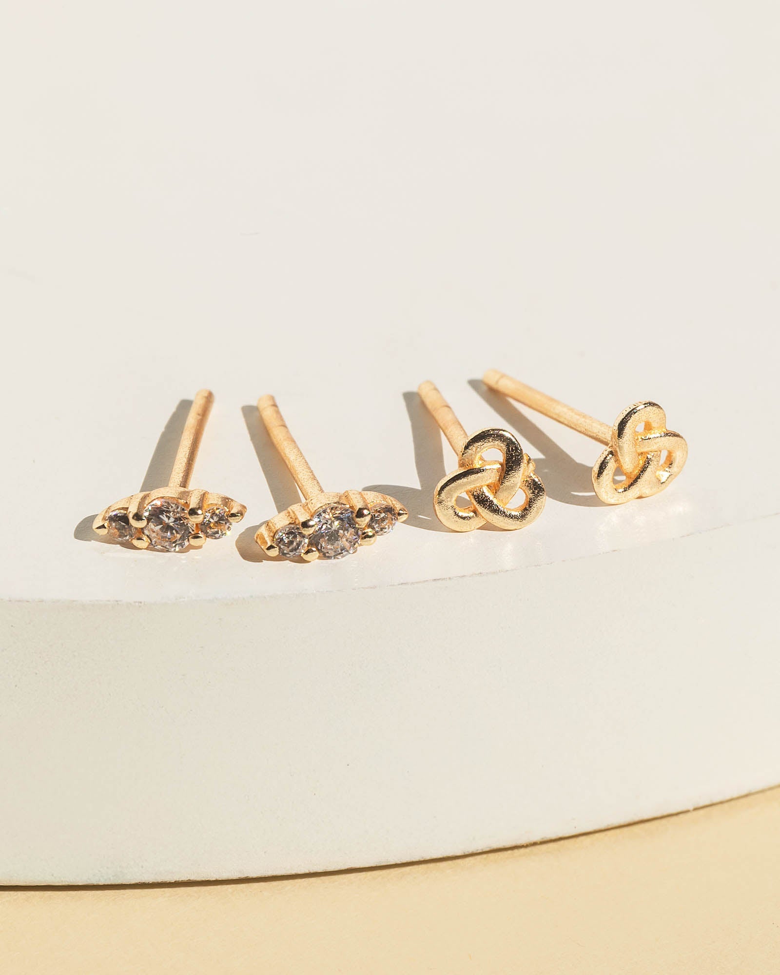 Create safe jobs with fair wages for women in areas of extreme poverty where vulnerable women are often exploited by sweatshops, when you purchase the Mini Stud Set. This dainty stud set from India includes the Knot Studs - a pair of studs that represent a knot, and the Crystal Studs - a pair of small, faceted crystal studs set in gold-tone prongs. These studs are perfect for everyday wear or multiple piercings. These classic studs create lasting change for families in India.