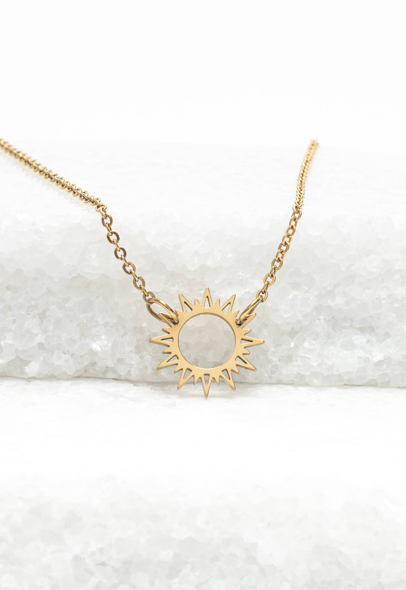 The Mallory Necklace is the perfect delicate piece to celebrate the hope and possibilities of each new day. The vibrant rays extending off the 14k gold plated circle pendant make this bestseller shine like the sun! Box size and color may vary.