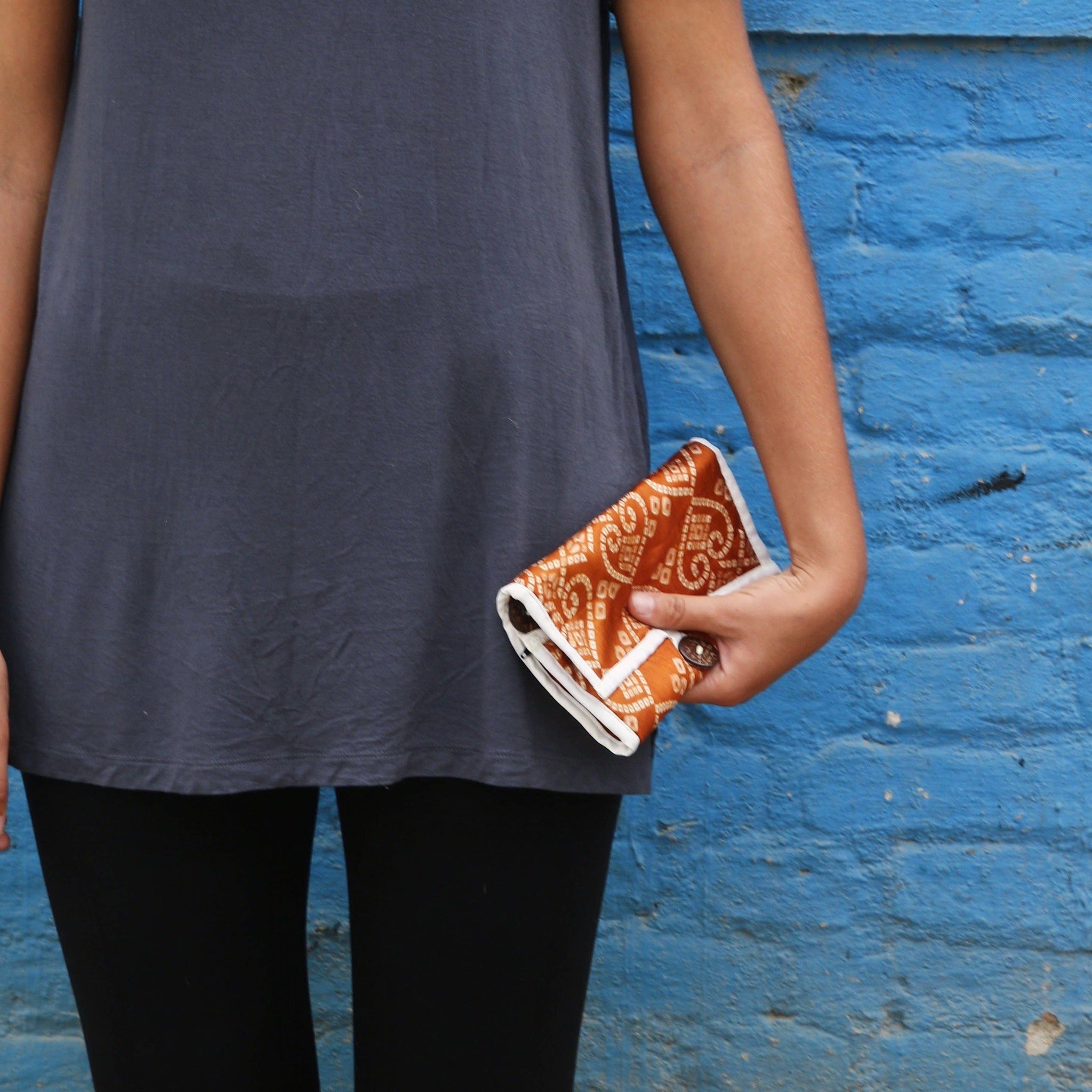 Wrap necklace chains around the coconut husk buttons and slip them into the main pouch. Made with recycled sari material, each is totally unique and special.