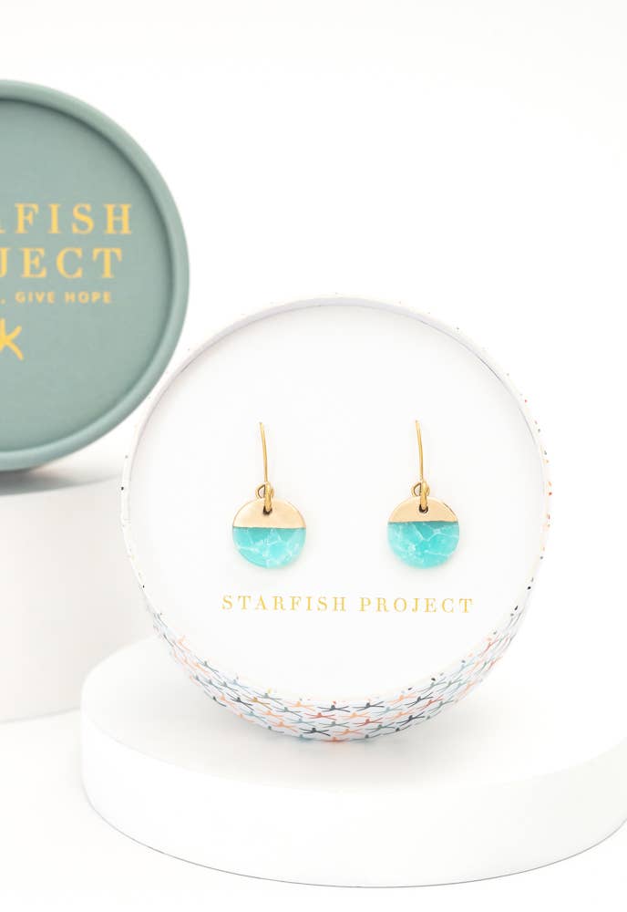 The gorgeous aqua blue stone dipped in 14K plated gold is just the refreshing pop of color to finish any look from daytime to date night. Your purchase of our modest-sized Refresh Earrings helps survivors of human trafficking and exploitation begin a new life of freedom! Box size and color may vary.