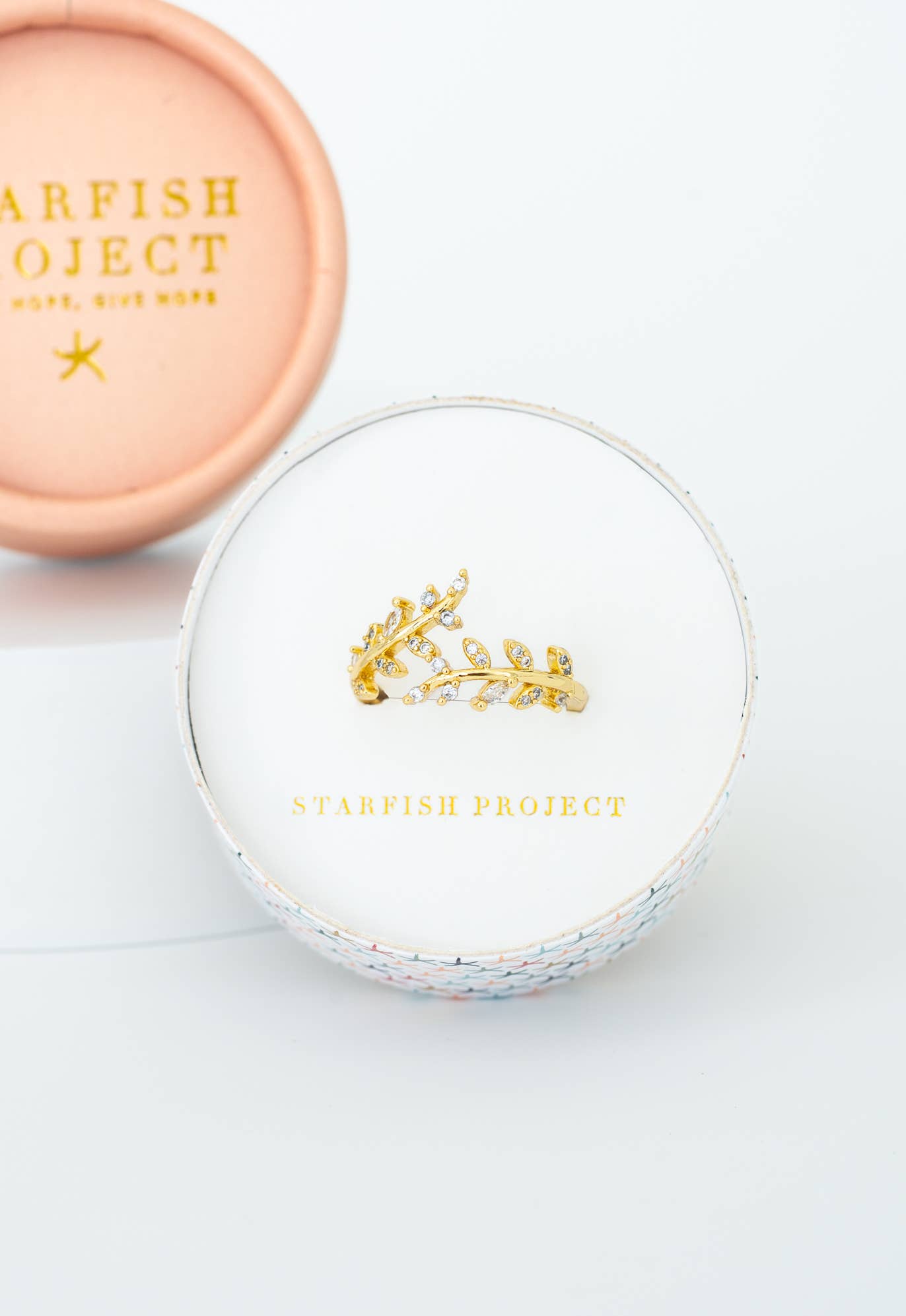 Inspired by the graceful beauty of nature, the Willow Branch Ring is a delicate symbol of resilience and renewal. Crafted in 18K plated gold and adorned with shimmering zircon stones, this adjustable ring offers both elegance and comfort, making it a perfect gift for someone special—or a meaningful addition to your own collection. Wear it as a reminder of growth, strength, and the beauty found in every season of life. With every purchase, you help create new beginnings for survivors of exploitation—offering safe work, education, and a path to a brighter future. Box size and color may vary.